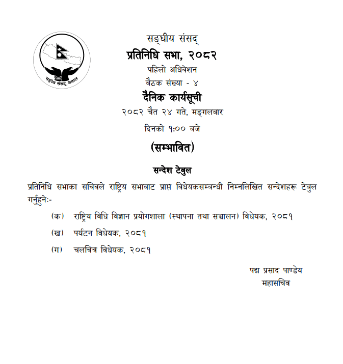 आजको बैठकमा ‘राष्ट्रिय विधि विज्ञान प्रयोगशाला (स्थापना तथा सञ्चालन) विधेयक, २०८१’, ‘पर्यटन विधेयक, २०८१’ र ‘चलचित्र विधेयक, २०८१’ प्रस्तुत गर्ने सम्भावित कार्यसूची छ ।