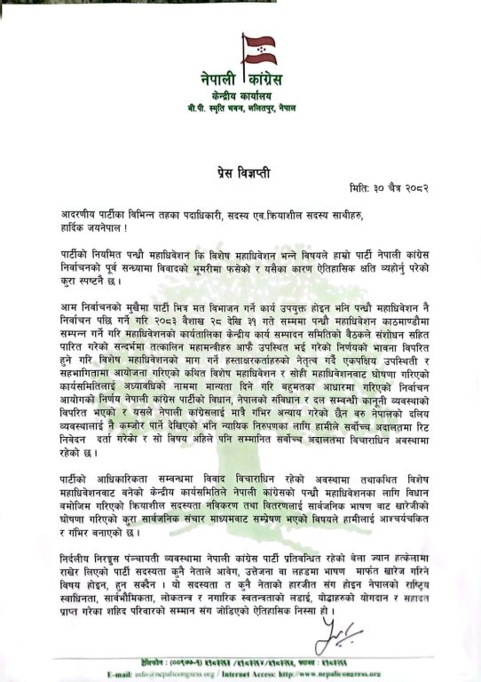 खड्काले पार्टीको आन्तरिक विवाद सर्वोच्च अदालतमा विचाराधीन रहेको अवस्थामा कुनै एक पक्षले महाधिवेशन घोषणा गर्नु वदनियतपूर्ण भएको पनि उल्लेख गरेका छन् ।