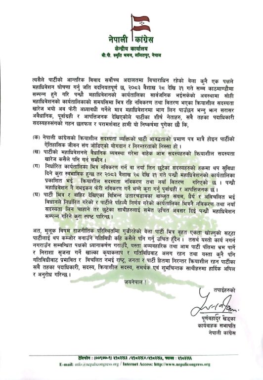 महाधिवेशनले वैधानिक व्यवस्था गरेमा बाहेक क्रियाशील सदस्यता कसैले खारेज गर्न सक्दैन : पूर्णबहादुर खड्का