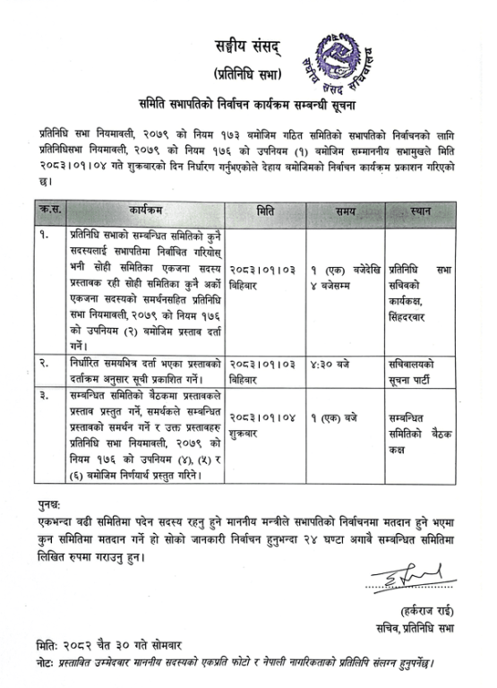 समिति सभापतिहरूको मनोनयन दर्ता सिंहदरबारस्थित प्रतिनिधिसभा सचिवको कार्यकक्षमा हुने सूचनामा उल्लेख छ । बिहीबार दिउँसो साढे ४ बजे नै उम्मेदवारहरूको सूची प्रकाशन गर्ने राईले जारी गरेको सूचनामा उल्लेख छ ।