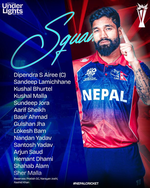 काठमाडौं । आगामी सोमबार र मंगलबार त्रिवि क्रिकेट मैदानमा हुने यूएईसँगको टी-२०आई शृंखला खेल्ने नेपाली टोलीको घोषणा भएको छ ।