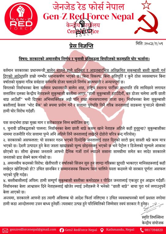 जेनजेड रेड फोर्सले सरकारलाई दोहोरो चरित्र नदेखाउन चेतावनी दिँदै चार बुँदे मागसमेत अघि सारेको छ । जसमा चुनावी प्रतिबद्धता कार्यान्वयन, सुकुम्बासीमाथि दमन रोक्न, गरिब जनताको संरक्षण तथा महँगी नियन्त्रण गर्नुपर्ने माग समावेश छन् ।