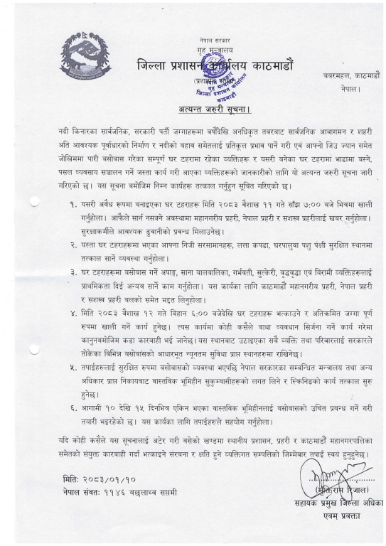 काठमाडौँ । जिल्ला प्रशासन कार्यालय काठमाडौँले नदी किनार तथा सार्वजनिक प्रयोजनका जग्गामा बनेका अनधिकृत बस्ती र संरचना तत्काल खाली गर्न निर्देशन दिएको छ। प्रशासनले शुक्रबार साँझ ७ बजेसम्म स्थान खाली नगरे संयुक्त रूपमा हटाउने कारबाही अघि बढाइने जनाएको हो।