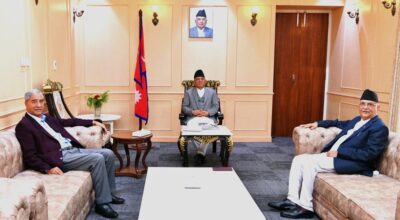 काठमाडौं । कांग्रेस सभापति शेरबहादुर देउवा र एमाले अध्यक्ष केपी ओली बालुवाटार पुगेका छन् ।