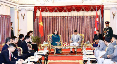 काठमाडौं । राष्ट्रपति रामचन्द्र पौडेलसँग नेपाल भ्रमणमा रहेकी समाजवादी गणतन्त्र भियतनामका उपराष्ट्रपति वो थि आन्ह