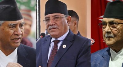 काठमाडौँ । प्रमुख दलका तीन शीर्ष नेताबीच सोमबार भेटवार्ता भएको छ । प्रधानमन्त्री कार्यालय सिंहदरबारमा