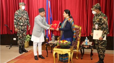 काठमाडौं । राष्ट्रपति विद्यादेवी भण्डारीसमक्ष महान्यायाधिवक्ता डा. दिनमणी पोखरेलले आर्थिक वर्षको वार्षिक प्रतिवेदन पेश गरेका