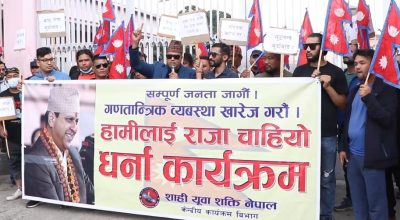 काठमाडौं । शाही युवा शक्ति नेपालले राजतन्त्र पुनःस्थापनाको माग गर्दै धर्ना दिएको छ । शनिबार