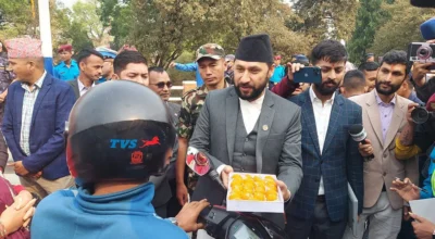 काठमाडौँ । उपप्रधानमन्त्री एवम् गृहमन्त्री रवि लामिछानेले सवारी चालक, यात्रु र ड्युटीमा रहेका प्रहरीहरूलाई मिठाइ