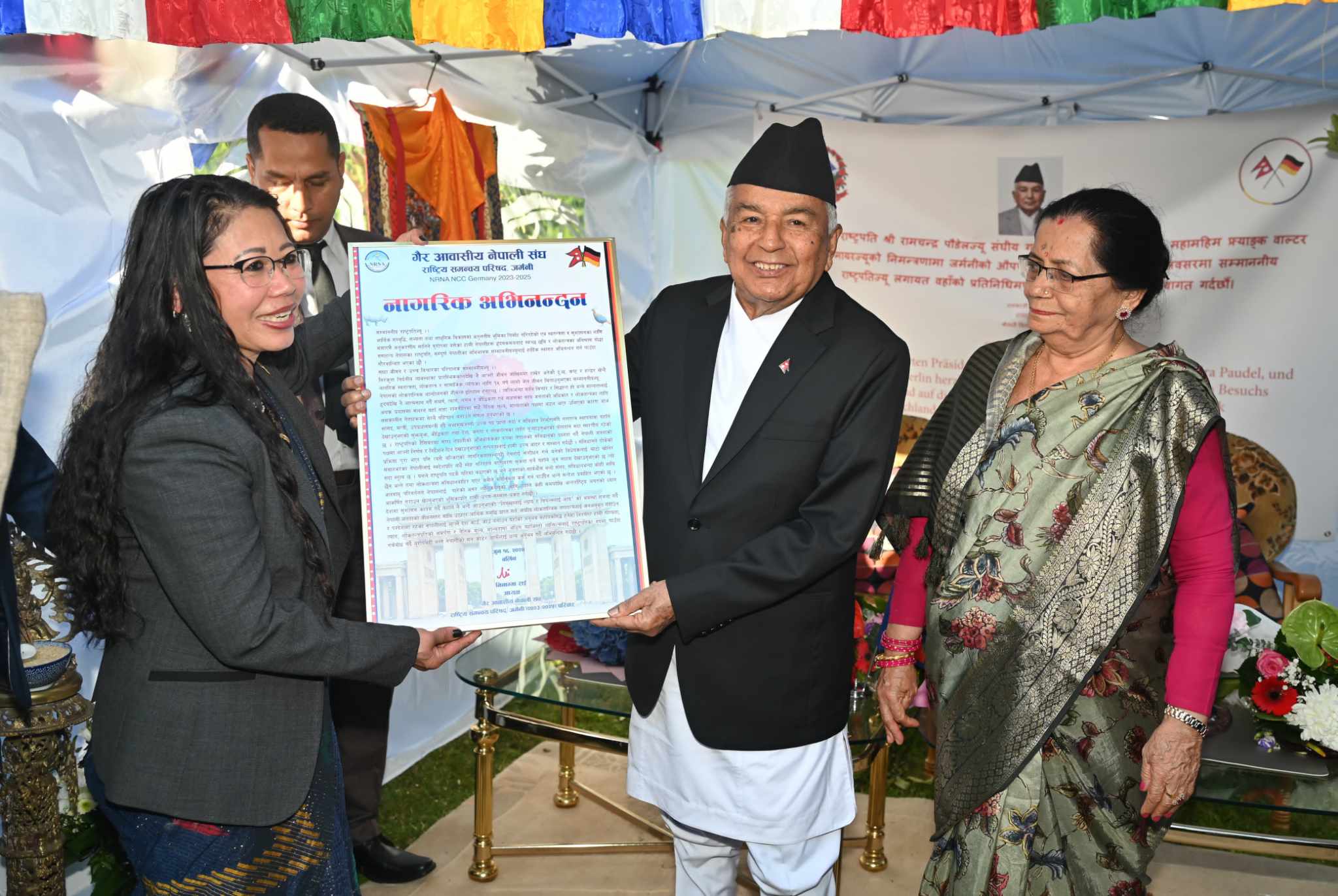 वर्लिन ( जर्मनी ) । मित्रराष्ट्र जर्मनीको भ्रमणमा रहेका राष्ट्रपति रामचन्द्र पौडेलको सम्मानमा जर्मनीको वर्लिनस्थित नेपाली राजदूतावासले आाइतबार विशेष स्वागत समारोह आयोजना गरेको छ। राष्ट्रपति पौडेलको सम्मानमा आयोजित समारोहमा प्रथम महिला सबिता पौडेल, भ्रमण दलका सदस्य र यहाँस्थित नेपालीको सहभागिता थियो। साे अवसरमा राष्ट्रपति पाैडेलले एक पटकको नेपाली सधैंको नेपाली रहेको धारणा व्यक्त गर्दै संसारमा…
