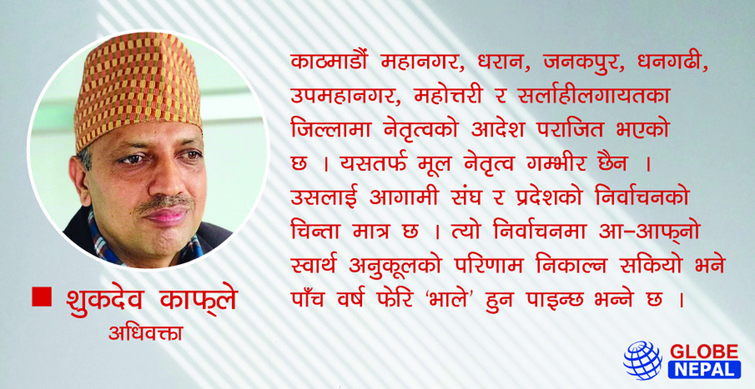 मूलधारका दलहरु र यसको नेतृत्वलाई स्थानीय निर्वाचनको परिणामले आफूलाई सच्चाउने थप समय र अवसर प्रदान गरेको छ । परिणाम आफ्नो पक्षमा ल्याउन र आफ्नो खास मान्छेलाई अबसर दिलाउन भए गरेको कसरतहरु गलत छन्, त्यो प्रवृत्ति र सोचलाई परास्त गर्नुपर्छ भन्ने अभिमत खास खास ठाउँका सचेत मतदाताहरुले प्रकट गरेका हुन् । दूरदराजदेखि तह तहका निर्वाचनहरुमा यस…
