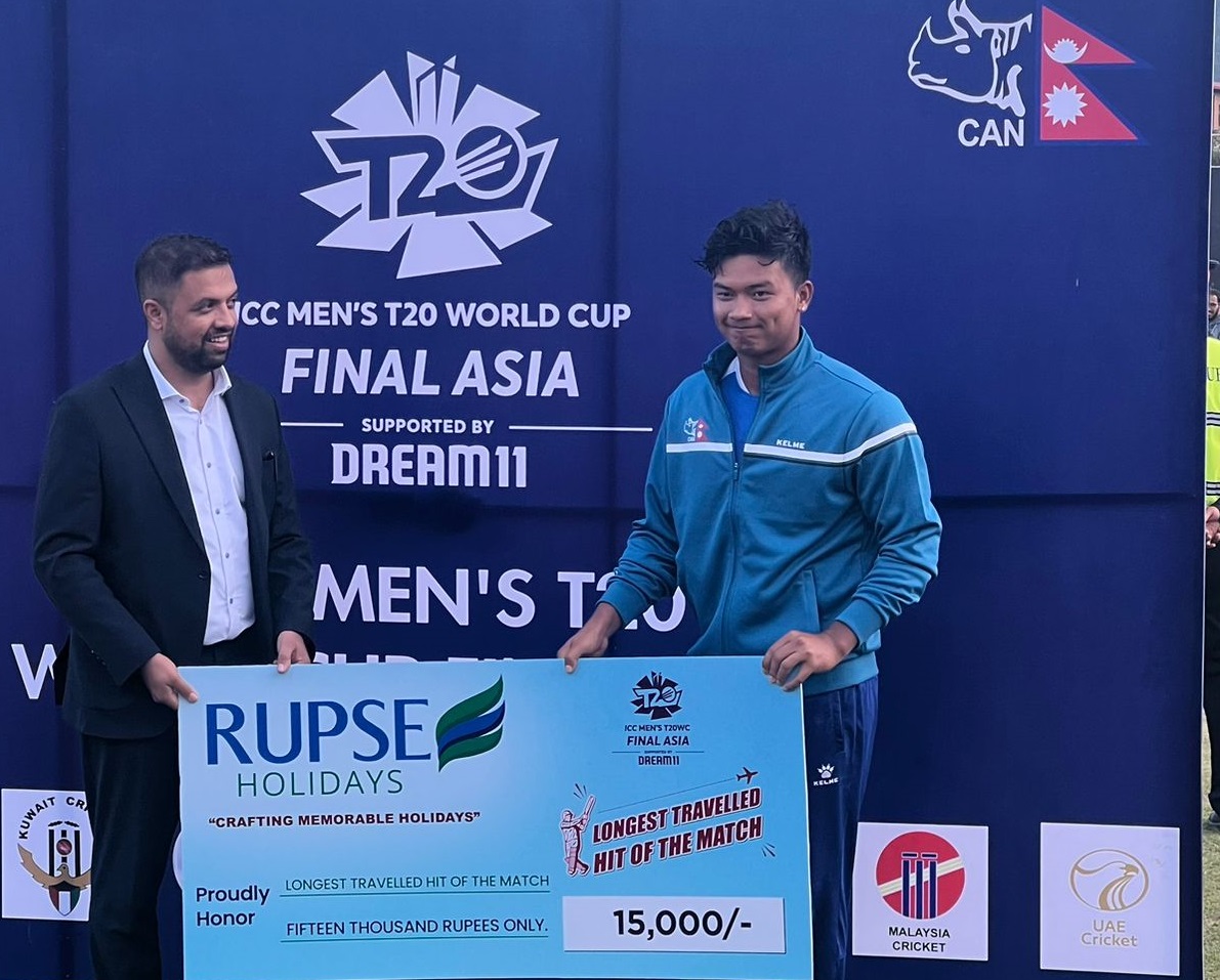 काठमाडौं । जारी टि–२० विश्वकप छनोट खेलमा मलेसियाविरुद्ध लामो दूरीको छक्का हान्ने कुशल मल्ललाई रुप्से होलिडेले १५ हजार रुपैयाँ नगद पुरस्कारले सम्मान गरेको छ । रुप्से होलिडेका निर्देशक रमेश पराजुलीले मल्ललाई उक्त पुरस्कार हस्तान्तरण गरेका हुन् । मलेसियाविरुद्ध कुशलले सर्वोधिक ६५ रनको योगदान दिएका थिए । उनले ३४ बलको सामना गर्दै ७ छक्का र २…