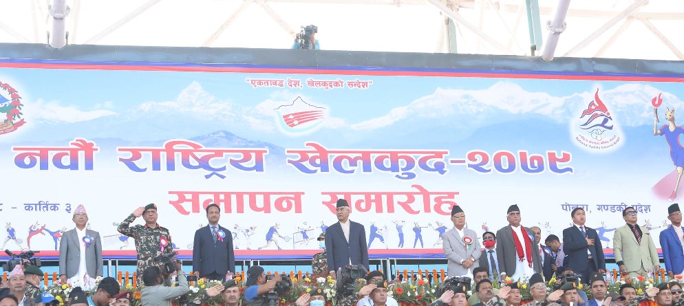 पोखरा । गण्डकी प्रदेशमा आयोजना भएको नवौं राष्ट्रिय खेलकुद प्रतियोगिता सम्पन्न भएको छ । गण्डकी प्रदेशको राजधानी पोखरा रंगशालामा बिहीबार विशेष समारोहकाबीच नवौं राष्ट्रिय खेलकुदको समापन गरिएको हो । ‘एकताबद्द देश, खेलकुदको सन्देश’ भन्ने नाराको साथ आयोजना भएको नवौं प्रधानमन्त्री शेर बहादुर देउवाको उपस्थितिमा समापन भएको हो । नवौंको उद्घाटन भने उपराष्ट्रपति नन्दबहादुर पुनले गरेका…