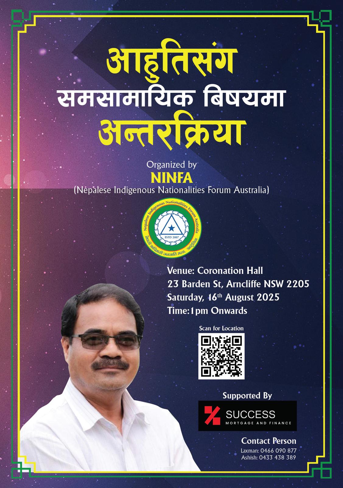 सिड्नी । नेपाल आदिवासी जनजाति मञ्च अष्ट्रेलिया (निन्फा) ले नेपालबाट आएका विश्वभक्त दुलाल (आहुती) सँग सामसामयिक विषयमा शनिबार अन्तरक्रिया गर्ने भएको छ । दिउँसो १ बजे आयोजना भएको उक्त कार्यक्रम सिड्नी बारडेनको सेन्ट एरेनक्लिफमा रहेको कोरोनेशन हलमा आयोजना हुनेछ । निन्फाले आइतबार साँझ पिटर्सह्याम टाउन हलमा अन्तर्राष्ट्रिय आदिवासी दिवस भव्यताका साथ मनाएको थियो । विश्व…