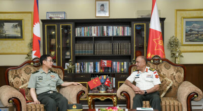 काठमाडौँ । चिनियाँ जनमुक्ति सेनाको टोली नेपाल भ्रमणमा आउने भएको छ । चिनियाँ सेनाका मेजर जनरल चाङ पाओछुनको नेतृत्वमा छ सदस्यीय टोली आगामी शनिवार नेपाल आउने कार्यक्रम छ । अन्तर्राष्ट्रिय सैन्य सहयोग कार्यालय (सिएमसी) उपप्रमुख रहेका जिम्मेवारीमा रहेका पाओछुनको नेतृत्वमा वरिष्ठ कर्नेलहरु छन पेइलिङ, सङ लिसिङ,लि यिङफङ, क्याप्टेन वाङ कुओचङ र सि सिआङयाङ रहेका छन्…