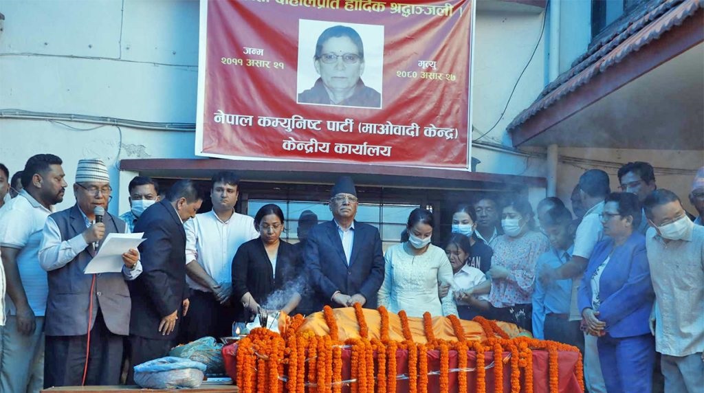 काठमाडौं । नेकपा माआवादी केन्द्रले पार्टीका अध्यक्ष तथा प्रधानमन्त्री पुष्पकमल दाहाल प्रचण्डकी पत्नी एंव पार्टीकी केन्द्रीय सल्लाहकार सीता दाहालको निधनप्रति पार्टीका सबै कार्यालयमा दुई दिनसम्म पार्टीको झन्डा आधा झुकाउने निर्णय गरेको छ । पेरिसडाँडामा बुधबार बसेको पदाधिकारी बैठकले बुधबार र बिहीबार माओवादीको सबै पार्टी कार्यालयमा झन्डा आधा झुकाउने निर्णय गरेको महासचिव देवप्रसाद गुरुङले जानकारी दिए…