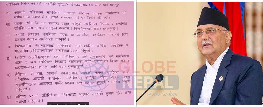 काठमाडौं । प्रमुख विपक्षी दल नेकपा एमालेले वैवाहिक अंगीकृतहरुको हकमा निश्चित समयको अन्तरालपछि मात्रै नागरिकता पाउने व्यवस्था गर्नुपर्ने बताएको छ । शुक्रबारदेखि सुरु भएको पार्टी केन्द्रीय कमिटी बैठकमा १९ पृष्ठ लामो राजनीतिक प्रतिवेदन पेश गर्दै एमाले अध्यक्ष केपी शर्मा ओलीले नागरिकता विधेयकबारे ७ बुँदे धारणा अघि सार्दै निश्चित समयको अन्तरालपछि मात्रै नागरिकता पाउनुपर्ने बताएका हुन्।…