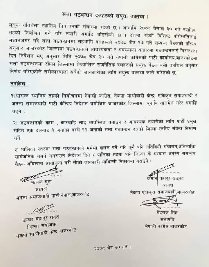 सुर्खेत । जाजरकोटमा आगामी ३० वैशाखमा हुने निर्वाचनमा सत्तारुढ दलहरूले तालमेल गर्ने निर्णय गरेका छन् । नेपाली कांग्रेसका जिल्ला सभापति बेदराज सिंहको अध्यक्षता बसेको बैठकले सत्तारुढ दलहरूले आगामी निर्वाचन तालमेल गर्ने निर्णय गरेका हुन् । आसन्न स्थानीय तहको निर्वाचनमा नेपाली कांग्रेस, माओवादी केन्द्र, एकीकृत समाजवादी र जनता समाजवादी पार्टीबीच चुनावी तालमेल गर्ने निर्णय भएको माओवादी…