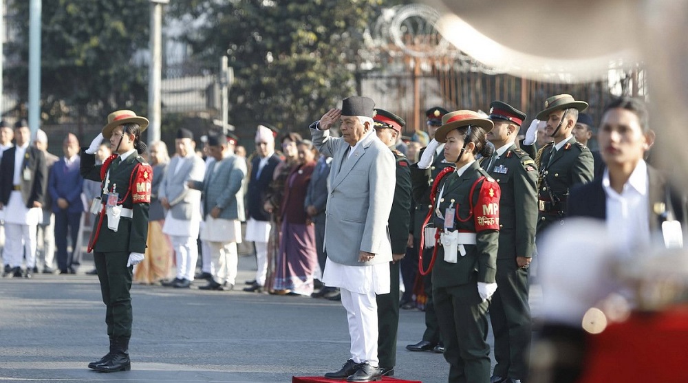 काठमाडौं । राष्ट्रपति रामचन्द्र पौडेलले ३०४ औं पृथ्वी जयन्ती तथा राष्ट्रिय एकता दिवसको उपलक्ष्यमा सिंहदरबार मूल गेट अगाडि रहेको पृथ्वीनारायण शाहको सालिकमा आइतबार बिहान माल्यार्पण गरेका छन् । राष्ट्रपति पौडेल कार्यक्रम स्थलमा पुग्नुहुँदा नेपाली सेनाको एक टुकडीले उनको सम्मानमा सलामी अर्पण गरेको थियो । सो समारोहमा उपराष्ट्रपति, प्रधानमन्त्री, प्रधानन्यायाधीश र राष्ट्रिय सभाका अध्यक्षलगायतको उपस्थिति थियो…