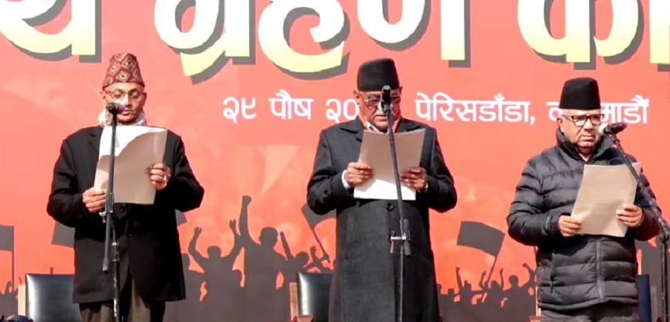 काठमाडौं । नेपाली कम्युनिस्ट पार्टी (नेकपा) का केन्द्रीय सदस्यहरूले शपथ लिएका छन् । पार्टी केन्द्रीय कार्यालय पेरिसडाँडामा मङ्गलबार दिउँसो २ हजार ४९९ केन्द्रीय सदस्यहरूले शपथ लिएका हुन् । जेष्ठ नेता एनके प्रसाईँले नेकपाका केन्द्रीय सदस्यहरूलाई शपथ गराएका हुन् । शपथ लगत्तै प्रसाईँले नेकपाका संयोजक पुष्पकमल दाहाल प्रचण्डलाई परिचय पत्र हस्तान्तरण गरेका थिए । नेकपाका नेता…