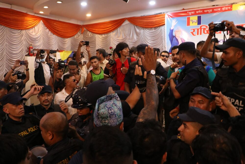 काठमाडौं । राप्रपा निकट युवा संगठनको काठमाडौं जिल्ला अधिवेशनमा विवाद भएपछि हात हालाहाल भएको छ । राष्ट्रिय प्रजातान्त्रिक युवा संगठन काठमाडौं जिल्ला अधिवेशनमा हात हालाहालको स्थिति आएपछि प्रहरी परिचालन गरिएको छ । केही युवाहरु मञ्चमा उक्लिएर होहल्ला गरेपछि हात हालाहाल भएको हो । त्यसपछि माइकिङ गर्दै औपचारिक कार्यक्रम सुरु नभइसकेकाले धैर्यपूर्वक बस्न आह्वान गरिएको थियो…