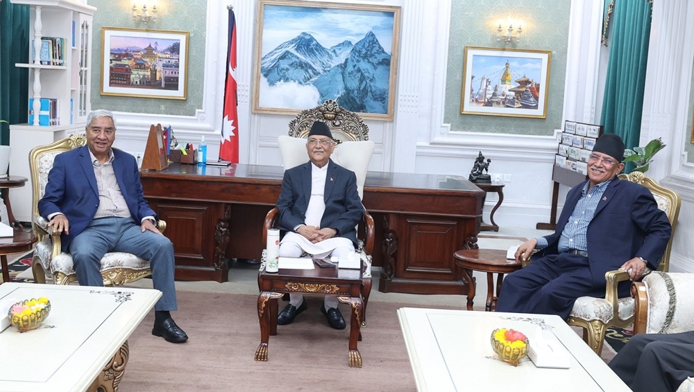 काठमाडौँ । प्रमुख तीन दलका शीर्ष नेताहरूको बैठक आज बस्दैछ । आज दिउँसो २ बजे सिंहदरवारमा बस्ने प्रधानमन्त्री सचिवालयले जनाएको छ। नेकपा (एमाले) का अध्यक्ष तथा प्रधानमन्त्री केपी शर्मा ओली नेपाली काँग्रेसका सभापति शेरबहादुर देउवा र प्रमुख प्रतिपक्षी दल नेकपा माओवादी केन्द्रका अध्यक्ष पुष्पकमल दाहाल ‘प्रचण्ड’ सहितको बैठक बस्न लागेको हो । बैठकमा संक्रमणकालीन न्यायबारे…