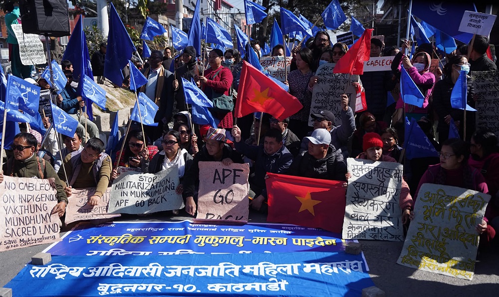 काठमाडौं । ताप्लेजुङको पाथीभरा क्षेत्रमा देखिएको विवादमा ‘नो केबलकार समूह’ ले काठमाडौंको माइतीघर मण्डलामा पनि प्रदर्शन गरेको छ । सोमबार विभिन्न प्लेकार्डसहित केबलकारविरोधी समूहले प्रदर्शन गरेको हो । प्रदर्शनमा उत्रिएका आन्दोलनरत पक्षले गृहमन्त्री रमेश लेखकको राजीनामा समेत माग गरेका छन् । उनीहरूले असक्षम गृहमन्त्रीले राजीनामा दे!, नो केबलकार, हजारौं प्रजातीका रुखहरू काट्ने विकास चाहिँदैन, सीडीओ…