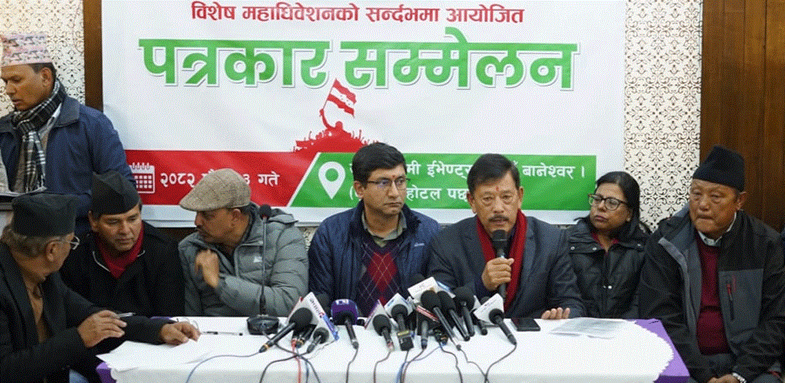 काठमाडौं । नेपाली काँग्रेस विशेष महाधिवेशन पक्षले आफूहरूले विशेष महाधिवेशन राखेकै दिन पार्टी कार्यालयमा युवा भेला राखेर संस्थापन पक्षले मुठभेडको अवस्था सिर्जना गर्न खोजेको आरोप लगाएको छ । बिहीबार काठमाडौँमा पत्रकार सम्मेलन गर्दै सो पक्षले विशेष महाधिवेशन राखेकै दिन काँग्रेस केन्द्रीय कार्यालयका तर्फबाट केन्द्रीय समितिका नाममा र युवा भेला भनेर केन्द्रीय कार्यालयमा अर्को एउटा भेला…