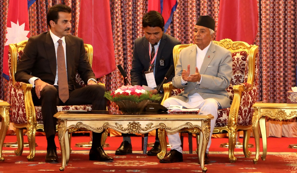 काठमाडौँ । नेपालको दुई दिने राजकीय भ्रमणमा काठमाडौँ आइपुगेका कतारका अमिर (राजा) शेख तमिम बिन हमाद अल थानी शितल निवास पुगेका छन् । आजै काठमाडौँ आइपुगेका अमिर थानी विमानस्थलबाट सिधै राष्ट्रपति निवास पुगेका हुन् । अहिले कतारी अमिरले राष्ट्रपति पौडेलसँग भेटवार्ता गरिरहेका छन् । राष्ट्रपति पौडेलले उनको सम्मानमा आज साँझ राजकीय भोजको आयोजना गर्दै छन्…