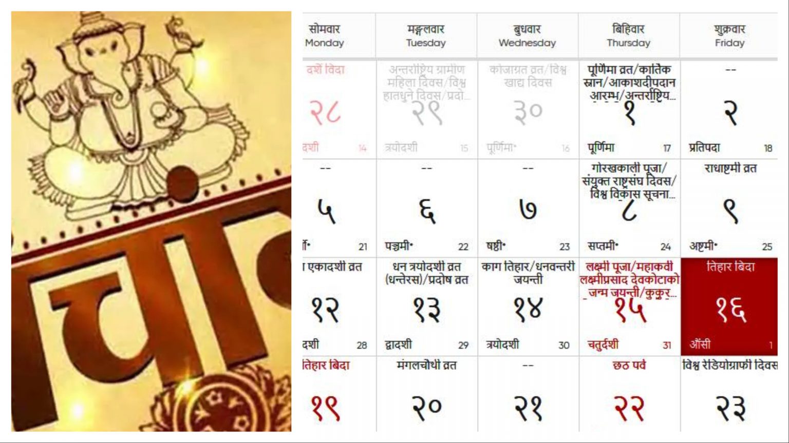 काठमाडौं । नेपालीको दोस्रो ठूलो चाड यमपञ्चक अर्थात् तिहारको औँसीको दिन भए पनि आज कुनै तिहारको पर्व भने नपरेको नेपाल पञ्चाङ्ग निर्णायक विकास समितिले जनाएको छ । औँसी बेलुकी भएका दिन गरिने लक्ष्मीपूजा बिहीबार नै गरिएको छ । औँसीसहित कार्तिक शुक्ल प्रतिपदा भएका दिन गरिने गाई पूजा भोलि शनिबार परेको पनि समितिले तिहारका सम्बन्धमा जारी…