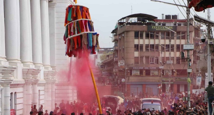 काठमाडौं । काठमाडौंको हनुमानढोका वसन्तपुरमा चीर ठड्याइएसँगै यो वर्षको होली पर्व शुरू भएको छ । आज बिहान ७ बजेर १३ मिनेटको साइतमा चीर ठड्याइएकाे हाे । बिहान साइतमा रङ्गीचङ्गी कपडाहरू झुन्ड्याइएको टुप्पोमा मयलको रुखको हाँगा बाँधिएको झन्डै ३२ फिट अग्लो बाँसको तीन खण्डे चीर ठड्याएको हो । त्यसपछि चीरलाई परिक्रमा गर्दै एकआपसमा अबीर छ्यापी हर्ष…