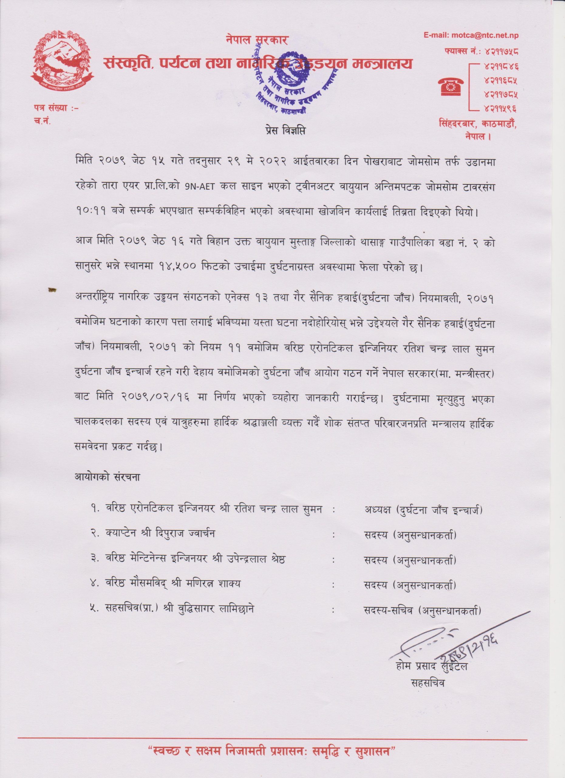 काठमाडौं । सरकारले आइतबार तारा एयरको विमान दुर्घटनाको कारण पत्ता लगाउन ५ सदस्यीय जाँच आयोग गठन गरेको छ । संस्कृति, पर्यटन तथा नागरिक उड्डयन मन्त्रालयले वरिष्ठ एरोनटिकल इन्जिनियर रतिशचन्द्र लाल सुमन दुर्घटना तथा जाँच इन्चार्ज रहने गरी आयोग गठन गरेको हो । आयोगको सदस्यहरूमा क्याप्टेन दिपु ज्वार्चन, वरिष्ठ मेन्टिनेन्स इन्जिनियर उपेन्द्र लाल श्रेष्ठ, वरिष्ठ मौसमविद…