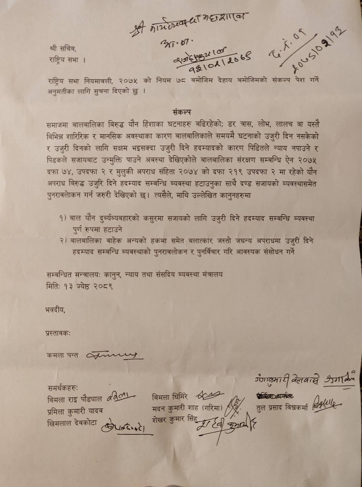 काठमाडौं । यौन हिंसा उजुरीको हदम्याद हटाउन माग गर्दै राष्ट्रिय सभामा संकल्प प्रस्ताव दर्ता भएको छ । सांसद् कमला पन्तको प्रस्तावमा विमला राय पौड्याल, प्रमिलाकुमारी यादव, खिमलाल देवकोटा, बिमला घिमिरे, मदनकुमारी शाह, शेखर कुमार सिंह, गंगा कुमारी बेलबासे र तुलप्रसाद विश्वकर्माले राष्ट्रिय सभामा संकल्प प्रस्ताव दर्ता गरेका हुन् । यौन हिंसा सम्बन्धी उजुरीका लागि रहेको…