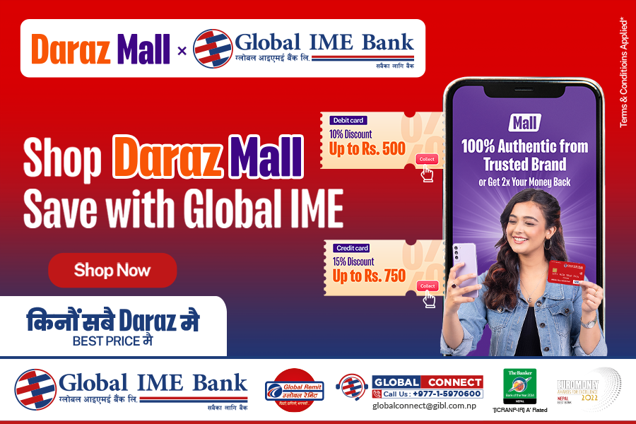 काठमाडौं । ग्लोबल आइएमई बैंक लिमिटेडका कार्ड बाहक ग्राहकहरुलाई दराजबाट (डीमल खण्ड) अनलाइनमार्फत सामान किन्दा १५ प्रतिशतसम्म छुट पाउने योजना सार्वजनिक भएको छ । फेब्रुअरी ५ देखि अप्रिल ३० सम्म (३ महिना) संचालनमा रहने यस छुट योजनाअन्तर्गत ग्राहकहरुले ग्लोबल आइएमई बैंकको भिजा (VISA) डेबिट वा क्रेडिट कार्ड प्रयोग गरी दराजबाट अनलाइनमार्फत सामान खरिद गर्दा कुल…