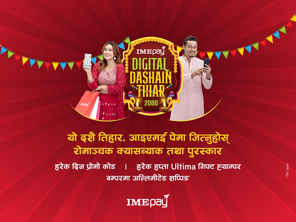 काठमाडौँ । नेपालको पहिलो डिजिटल वालेट ‘आइएमई पेले आउदै गरेको राष्ट्रिय चाड दशैं , तिहार तथा छठलार्ई लक्षित गर्दै 'आइएमई पे डिजिटल दशैं तिहार’ अभियान सार्वजनिक गरेको छ। असोज १४ गते देखी शुरु भई मङ्सिर ३ गते सम्म चल्ने ५० दिनको उक्त अभियान अन्तर्गत हरेक दिन ५० जना भाग्यशाली सेवाग्राहीहरुले बिभिन्न कारोबारको लागि क्यासब्याकको प्रोमो…