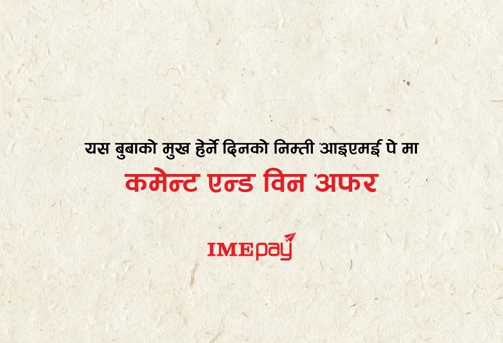 काठमाडौँ । नेपालको पहिलो डिजिटल वालेट "आइएमई पे" ले बुवाको मुख हेर्ने दिनलाई लक्षित गर्दै “Memories with Father: Share the Joy” नामक अफर सार्वजनिक गरेको छ । भदौ २६ देखी भदौ २८ गते सम्म चल्ने सो अफरमा सेवाग्राहीले आइएमई पेको फेसबुक पेजमा रहने “बुवाको मुख हेर्ने दिन” सम्बन्धित पोस्टमा आफु र आफ्नो बुवाको मिठा, रमाइला…