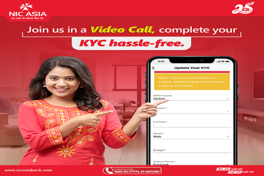 काठमाडौं । डिजिटल बैंकिङ्गमा मुलुकको अग्रणी स्थानमा रही सहज बैंकिङ्ग सेवा तथा सुविधा प्रदान गर्दै आइरहेको एनआईसी एशिया बैंकले आफ्ना ग्राहकहरूको लागि ल्याएको Video KYC (VKYC) सेवा अन्तर्गत अनलाईन भिडियो कल गरी KYC विवरण अद्यावधिक, खाता सुचारु, बचत खाताको स्कीम परिवर्तन, हस्ताक्षर अद्यावधिक तथा मोबाइल नम्बर वा ईमेल ठेगाना अद्यावधिक गर्न सकिने सुविधा ल्याएको छ…