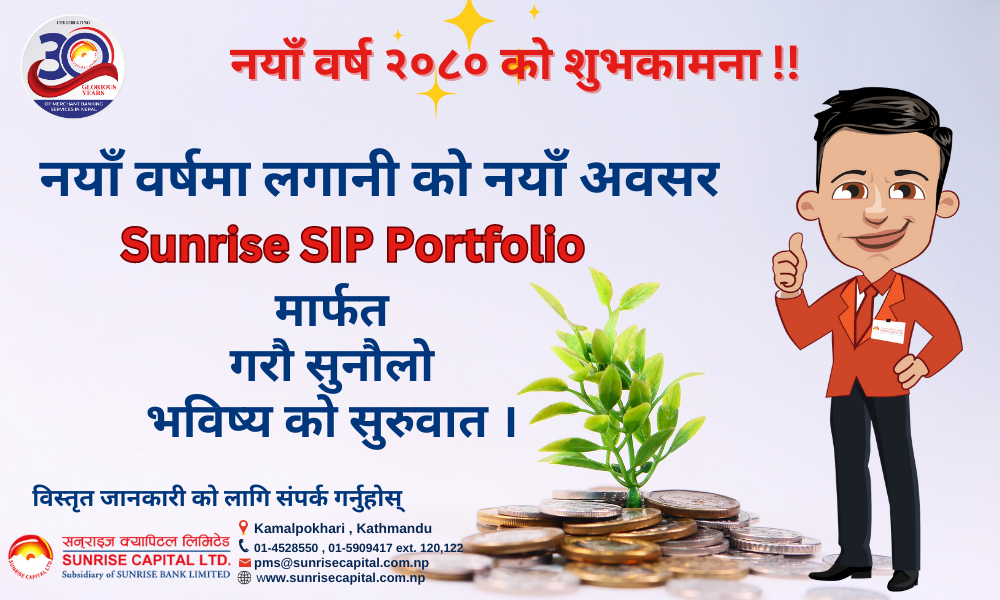 काठमाडौं । नयाँ वर्ष २०८० को पावन अवसरमा यस सन्राईज क्यापिटल लिमिटेडले वर्तमान पुंँजी वजारको अवस्थालाई ध्यानमा राखी आफ्ना ग्राहक वर्गहरुलाई दीर्घकालिन लगानीमा सहभागिता गराउने तथा आकर्षक प्रतिफल उपलब्ध गराउने लक्ष सहित लगानी व्यवस्थापन सेवा अन्तर्गत नयाँ एस आई पि पोर्टफोलियो योजना(SIP Portfolio Scheme) संचालनमा ल्याएको छ । उक्त योजनामा सहभागि हुने लगाानीकर्ताहरुले निश्चित समय…