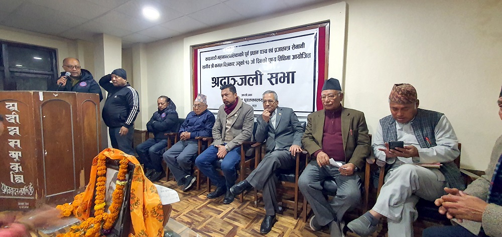 काठमाडौं । प्रजातन्त्र सेनानी स्व. कमल चित्रकारको १३ औं दिनको पुण्य तिथिका अबसरमा ह्वील चेयर र स्टेचर हस्तान्तरण गरिएको छ । तेह्रौं पुण्य तिथीका अबसरमा आयोजित श्रद्धाञ्जली सभाको अवसरमा ह्वील चियर र स्टेचर हस्तान्तरण गरिएको हो । प्रदिप्त पुस्तकालयका संरक्षक तेजबहादुर चित्रकार अध्यक्षतामा शनिबार सम्पन्न श्रद्धाञ्जलीसभामा मछिन्द्र क्लबका अध्यक्ष सुनिल कपालीलाई ह्वील चेयर हस्तान्तरण गरिएको…