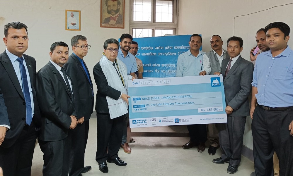 काठमाडौं । एनएमबि बैंक लिमिटेडले सस्थागत सामाजिक उत्तरदायित्व अर्न्तगत जनकपुरधामको श्री जानकी आँखा अस्पतालमा रु १,५१,०००/- को चेक हस्तान्तरण गरेको छ । उक्त सहयोग त्यस अस्पतालमा आवश्यक उपकरणहरु खरिद गर्नको लागि हस्तान्तरण गरिएको हो । सो कार्यक्रममा बैंकको तर्फबाट प्रमुख कार्यकारी अधिकृत सुनिल केसी, नायव प्रमुख कार्यकारी अधिकृत गोविन्द घिमिरे, प्रदेश प्रमुख कमल पोखरेल, एरिया म्यानेजर…