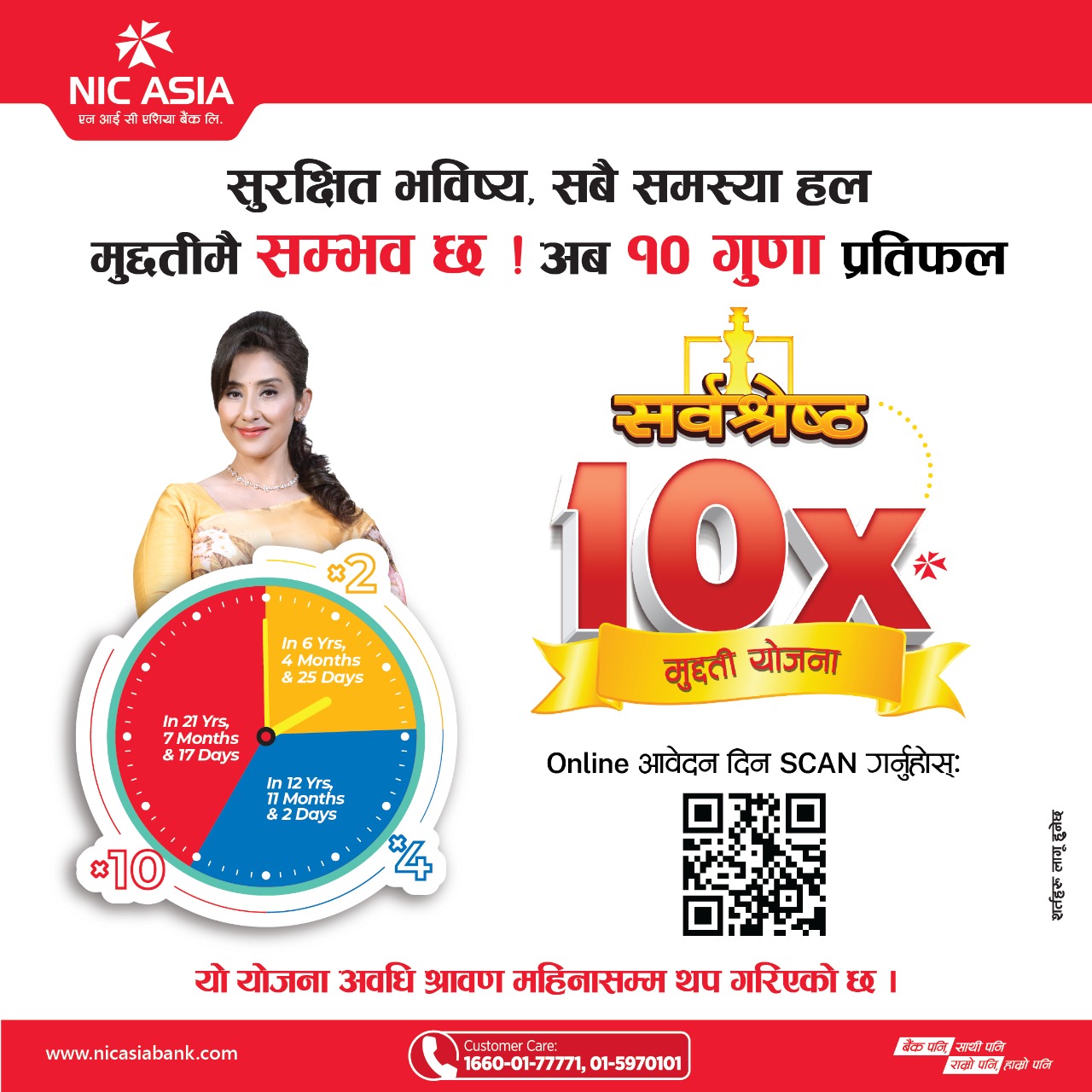 काठमाडौं । आई सी एशिया बैंकले ‘एन आई सी एशिया सर्वश्रेष्ठ १० गुणा मुद्दती योजना’ लाई श्रावण मसान्तसम्मका लागि निरन्तरता दिएको छ । बैँकले शनिबार एक विज्ञप्ति निकाल्दै उक्त योजना श्रावण मसान्तसम्म कायम गरिएको जनाएको छ । बैँकका अनुसार गत आषाढ १२ देखि आषाढ मसान्तसम्मको लागि निक्षेपको १० गुणासम्म प्राप्त हुने ‘एन आई सी एशिया…