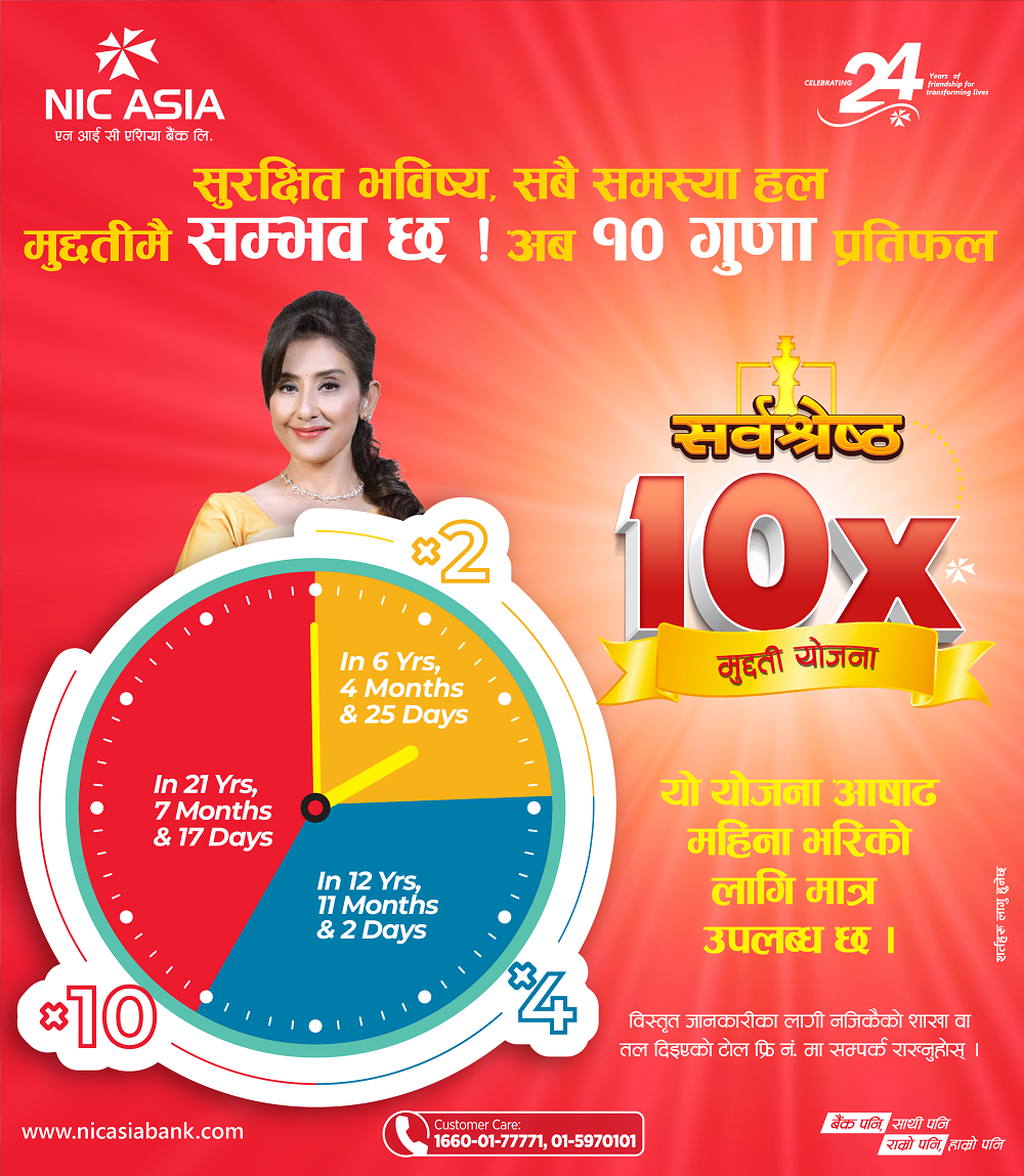 काठमाडाैं । देशको दुरदराजमा रहेका लाखौं ग्राहकहरू माझ सहज, सबल, गतिशील, विश्वसनीय र उत्तरदायी बैंकिङ्गको अभ्यास गर्दै आइरहेको एनआईसी एशिया बैंकले २०७९ आषाढ १२ गते देखि निक्षेप रकमको १० गुणा रकम फिर्ता हुने सर्वाधिक उच्च ब्याजदर सहितको नवीनतम ‘एन आई सी एशिया सर्वश्रेष्ठ १० गुणा मुद्दती योजना’ सार्वजनिक गरेको छ । यस आकर्षक योजना व्यक्तिगत,…