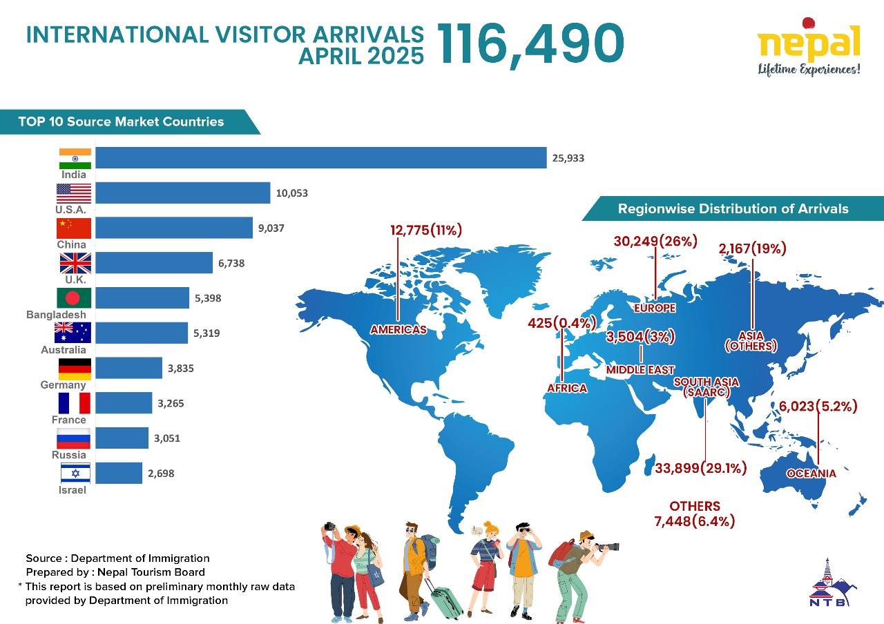 काठमाडौं । गत अप्रिल २०२५ मा १ लाख १६ हजार ४ सय ९० अन्तर्राष्ट्रिय पर्यटकले नेपाल भ्रमण गरेका छन् । नेपालको पर्यटन इतिहासमा सबैभन्दा राम्रो अप्रिल महिना भएको नेपाल पर्यटन बोर्डले जनाएको छ। जुन कोभिड महामारी पछि अप्रिलमा आएका पर्यटनको संख्या १०६.५ प्रतिशत बढी भएको बोर्डको दावी छ । ‘पूर्व महामारी स्तरमा पुगेका छौं, बलियो…
