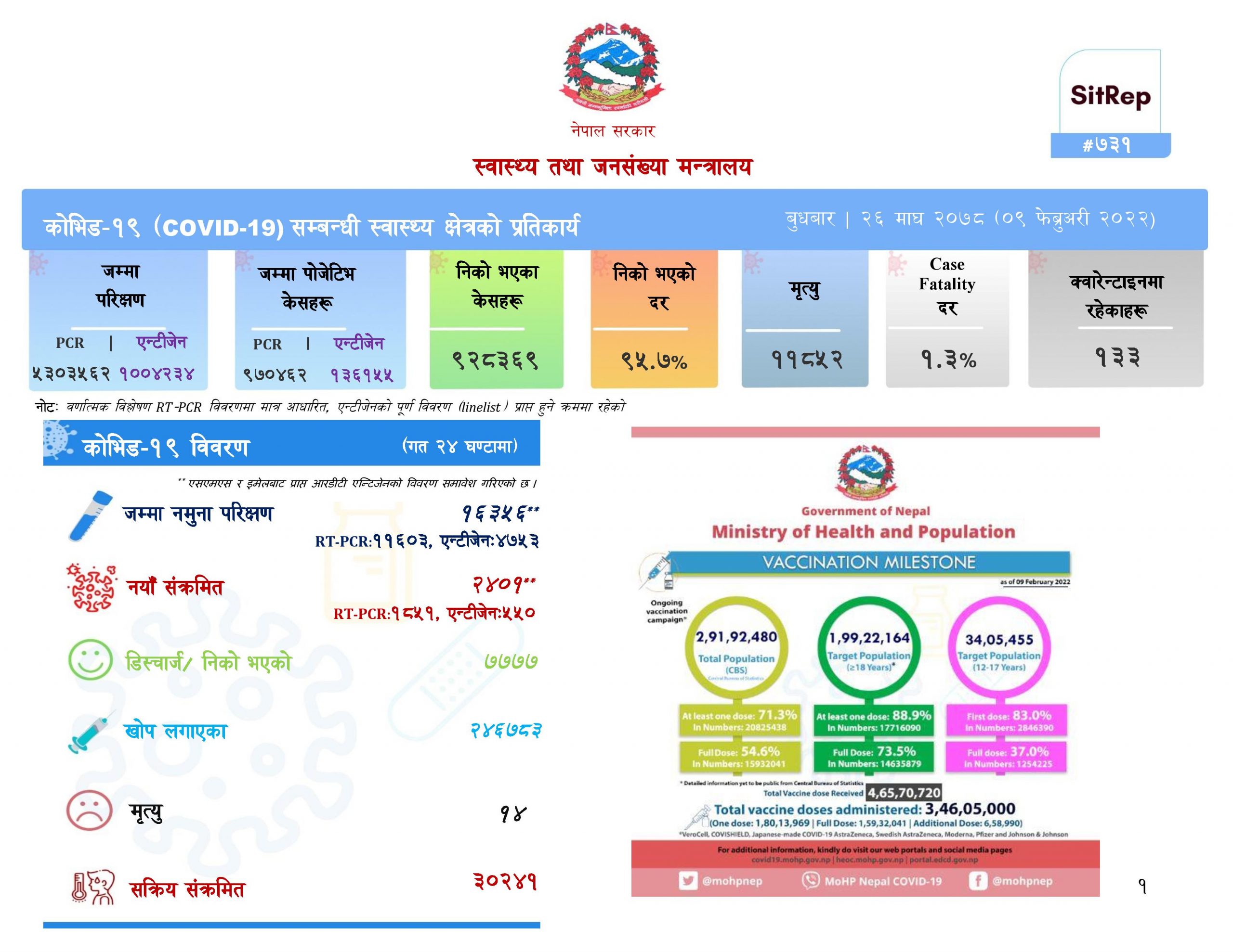 काठमाडौं । पछिल्लो २४ घण्टामा २४०१ जनामा कोरोना भाइरस (कोभिड-१९) संक्रमण पुष्टि भएको छ । स्वास्थ्य तथा जनसंख्या मन्त्रालयका अनुसार १६ हजार ३५६ जनाको नमुना परीक्षण गर्दा २४०१ जनामा संक्रमण पुष्टि भएको हो । मन्त्रालयका अनुसार पछिल्लो २४ घण्टामा ७,७७७ जना संक्रमणमुक्त भएका छन् भने १४ जनाको मृत्यु भएको छ । पछिल्लो २४ घण्टामा काठमाडौं…