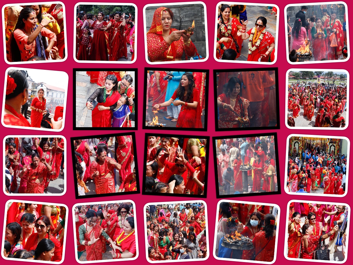 काठमाडाैं । हरितालिका तीजका अवसरमा भगवान पशुपतिनाथको दर्शन गर्न आएका सर्वसाधारण । दर्शनार्थीलाई सहज होस् भनेर आज पशुपतिनाथ मन्दिरका सबै चार ढोका खुलाइएको छ । श्रीमानकाे दीर्घायूकाे कमना गर्दै यस दिन नेपाली महिलाले निराहार व्रत बस्ने गर्छन् । व्रत बसेकै अवस्थामा शिवालयहरूमा नाँचगान र रमाइलाे समेत गर्ने गर्छन् ।