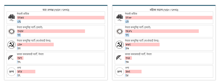 काठमाडौं । स्थानीय तहको निर्वाचन अन्तर्गत महानगर, उपमहानगर, नगर र गाउँपालिकामा निर्वाचित हुने ६ हजार ७ सय ४३ वडाध्यक्ष मध्ये धेरै जसो निर्वाचित भइसकेका छन् । निर्वाचन आयोगले राखेको तथ्यांक अनुसार हालसम्म ४ हजार ८ सय ६७ वडाध्यक्ष निर्वाचित भइसकेको छन् । जसमा सबैभन्दा धेरै नेपाली काँग्रेसका १ हजार ९ सय ६२ जना र एमालेका…