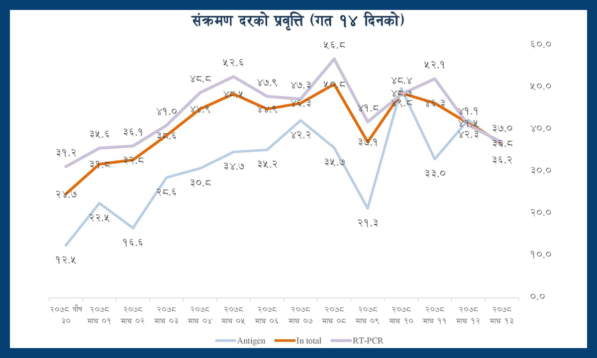 काठमाडौं । नेपालमा कोरोना भाइरस संक्रमण दर स्थिर रहेको स्वास्थ्य तथा जनसंख्या मन्त्रालयले जनाएको छ । पछिल्लो २४ घण्टामा २१ हजार ८ सय ८ जनामा गरिएको नमूना परीक्षणमा ८ हजार १७ जनामा संक्रमण भएको मन्त्रालयले जनाएको छ । मृत्युमा भने उल्लेख्य वृद्धि भएको छ । २४ घण्टामा १५ जनाको मृत्यु भएको छ । हालसम्म कोरोनाबाट…
