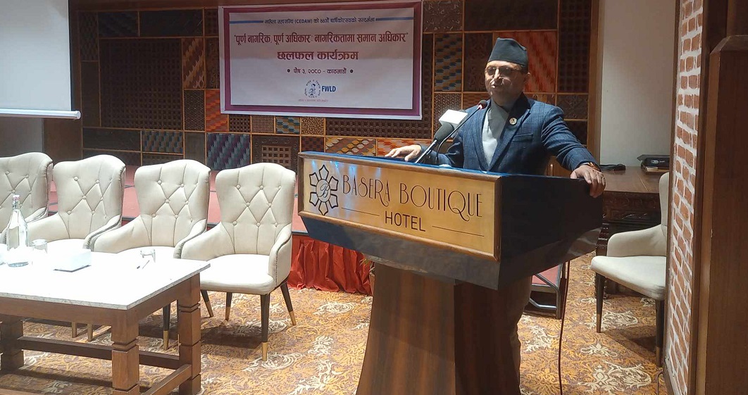 काठमाडौं । राष्ट्रियसभाका अध्यक्ष गणेश तिमिल्सिनाले समान अधिकार कानुनमा लेखेर मात्र नपुग्ने व्यवहारमा नै लागू गर्नुपर्ने बताएका छन् । महिला महासन्धिको ४४औँ वार्षिकोत्सवका अवसरमा महिला, कानुन र विकास मञ्च (एफडब्लुएलडी) ले मंगलबार आयोजना गरेको ‘पूर्ण नागरिक पूर्ण अधिकार ः नागरिकतामा समान अधिकार’ विषयक कार्यक्रममा उनले कानुनमा लेखेका कुरा व्यवहारमा कार्यान्वयन हुनुपर्नेमा जोड दिए । ‘नेपालमा…