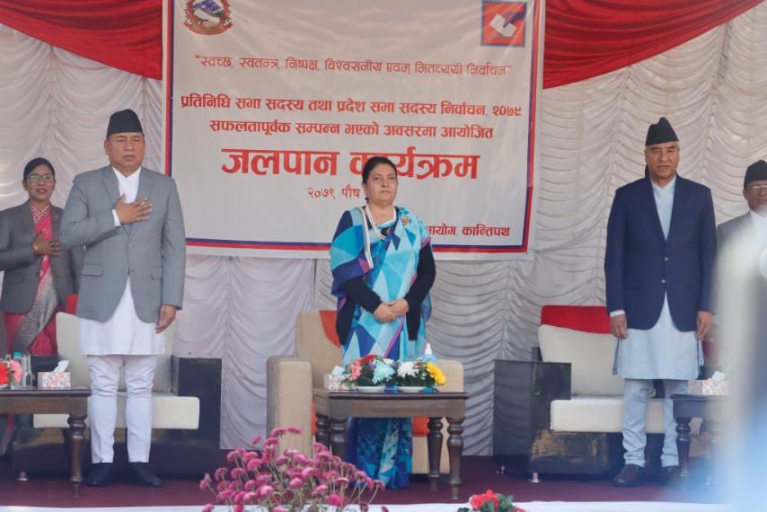 काठमाडौं । निर्वाचन आयोगले गत ४ मंसिरमा सम्पन्न प्रतिनिधिसभा र प्रदेशसभाबाट निर्वाचित सांसदहरूलाई स्वागत तथा बाधाई दिने उदेश्यले आज जलपान कार्यक्रम आयोजना गरेको छ । निर्वाचन आयोग परिसर कान्तिपथमा आयोजित कार्यक्रममा राष्ट्रपति विद्यादेवी भण्डारी, उपराष्ट्रपति नन्दबहादुर पुन, प्रधानमन्त्री शेरबहादुर देउवा, राष्ट्रिय सभाका अध्यक्ष गणेशप्रसाद तिमिल्सिना लगायत उच्च पदस्थ व्यक्तिहरूको उपस्थिति रहेको छ । कार्यक्रममा देशभरबाट प्रत्यक्ष…