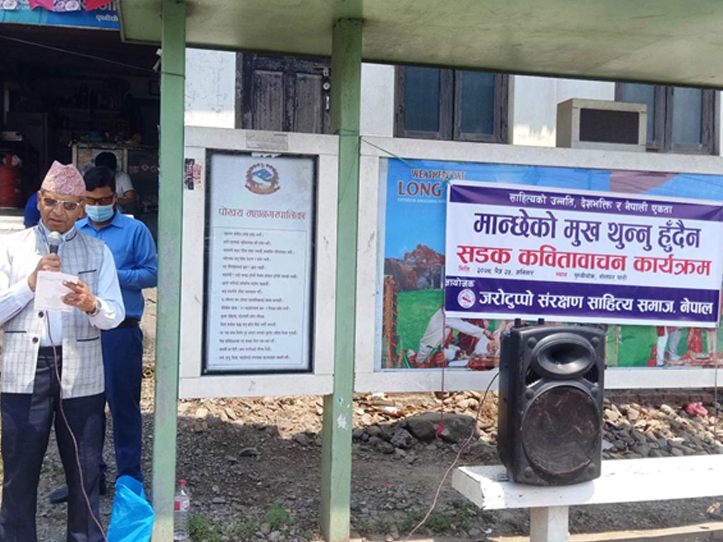 गण्डकी । जरोटुप्पो संरक्षण साहित्य समाज नेपालको आयोजनामा शनिबार पोखरामा ‘मान्छेको मुख थुन्न हुँदैन’ सडक कविता वाचन गरिएको छ । संविधानभन्दा माथि कोही नहुने र पछिल्लो समयमा देशमा भइरहेका विभिन्न घटनाक्रमको साङ्केतिक विरोधस्वरुप पृथ्वीचोकको गोलघर अगाडि उक्त कविता वाचन गरिएको संस्थाका महासचिव मदन भण्डारीले जानकारी दिए । विकृति, विसङ्गतिप्रति सम्बन्धित निकायको चासो नपुगेको जनाउँदै उनले…